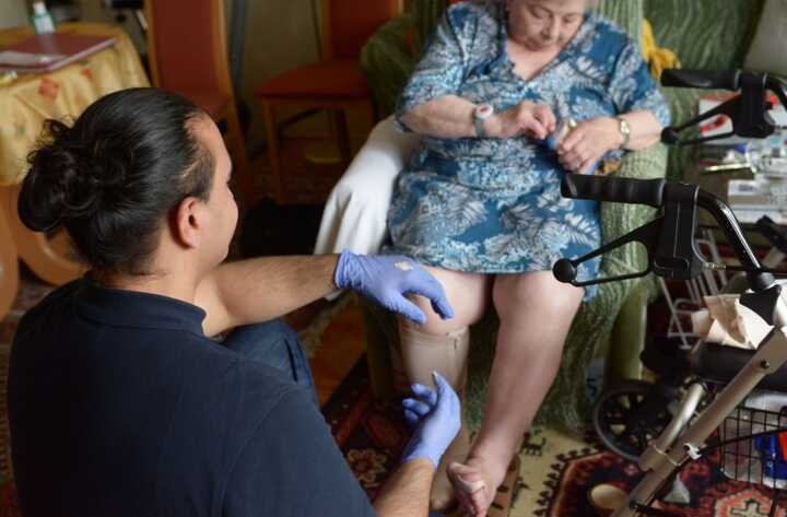 Beschreibung:Auf dem Bild ist eine Pflegekraft zu sehen, die einer älteren Person bei der Beinpflege hilft.