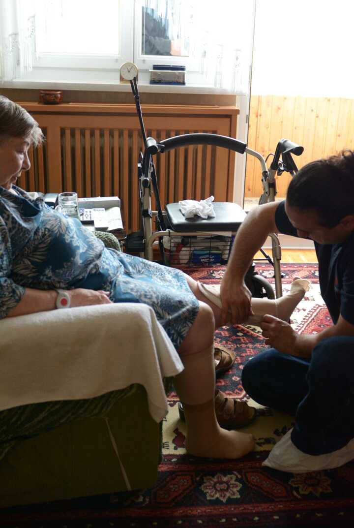Beschreibung:Ein Pflegeassistent hilft einer älteren Person bei der Pflege ihres Beins.