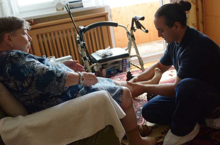 Beschreibung:Ein Pflegekraft hilft einer älteren Person beim Anziehen von Kompressionsstrümpfen.