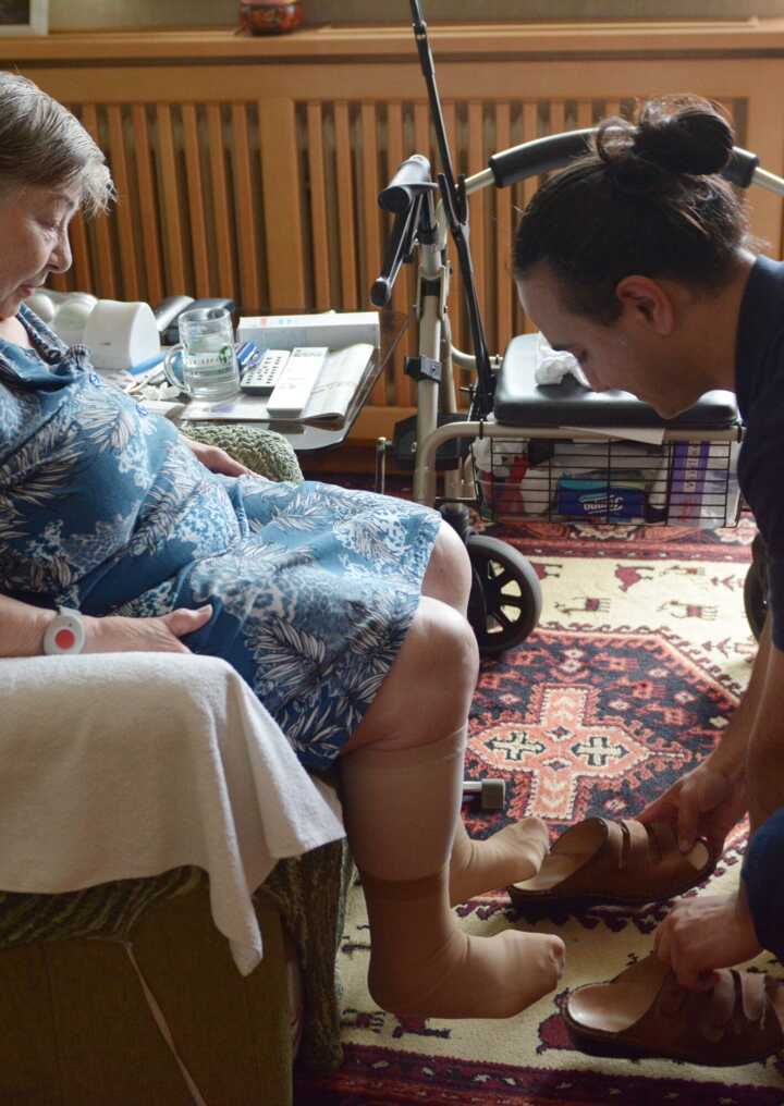 Beschreibung:Das Bild zeigt eine Pflegekraft, die einer älteren Person beim Anziehen von Schuhen hilft.