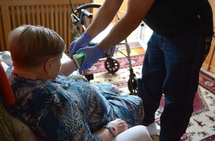 Beschreibung:Eine Pflegekraft misst den Blutdruck einer älteren Person.