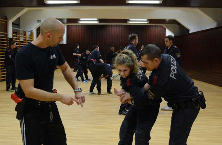 Beschreibung:Auf dem Bild sind Exekutivbedienstete in Polizeiuniformen zu sehen, die an einem Training teilnehmen.