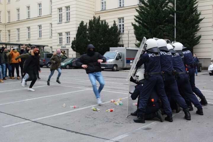Beschreibung:Auf dem Bild sind Exekutivbedienstete im Polizeidienst in Schutzausrüstung zu sehen, die sich gegen eine Gruppe von Demonstrierenden verteidigen.
