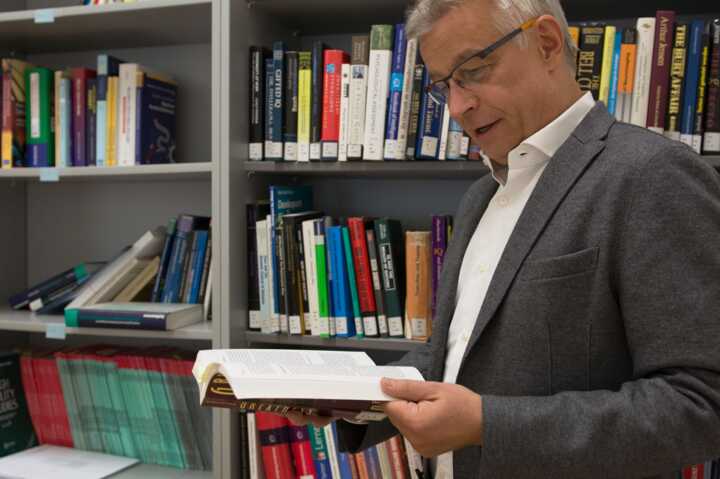 Beschreibung:Ein Psychologe steht in einer Bibliothek und liest ein Fachbuch.