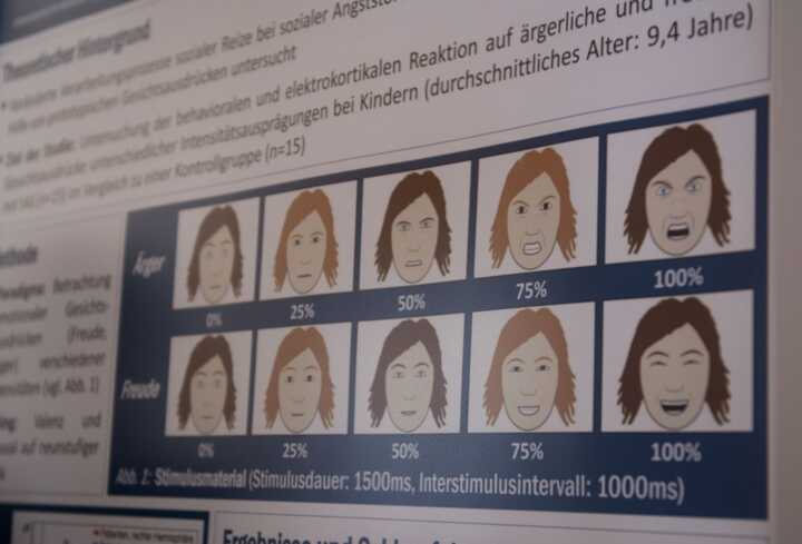 Beschreibung:Das Bild zeigt eine Darstellung von Gesichtsausdrücken, die in der Psychologie zur Analyse von Emotionen verwendet wird.