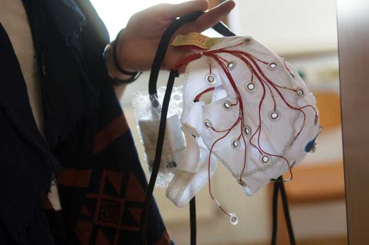 Beschreibung:Ein Psychologe hält eine EEG-Haube, die in der Neurowissenschaft und psychologischen Diagnostik verwendet wird.