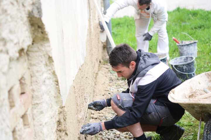 Beschreibung:Auf dem Bild sind zwei Restauratoren zu sehen, die eine Wand verputzen.