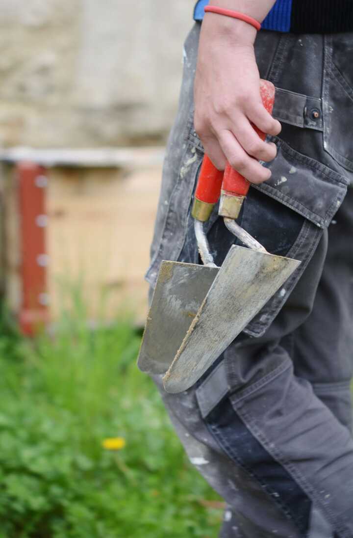 Beschreibung:Ein Restaurator in Arbeitsbekleidung hält zwei Maurerkellen.