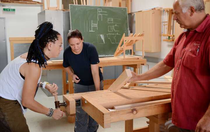 Beschreibung:In dem Bild sehen wir Zimmer(er)Innen, die in einer Werkstatt mit Holz arbeiten.