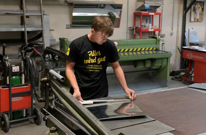 Beschreibung:Ein Bauspengler arbeitet in einer Metallwerkstatt und misst ein Blechstück ab.