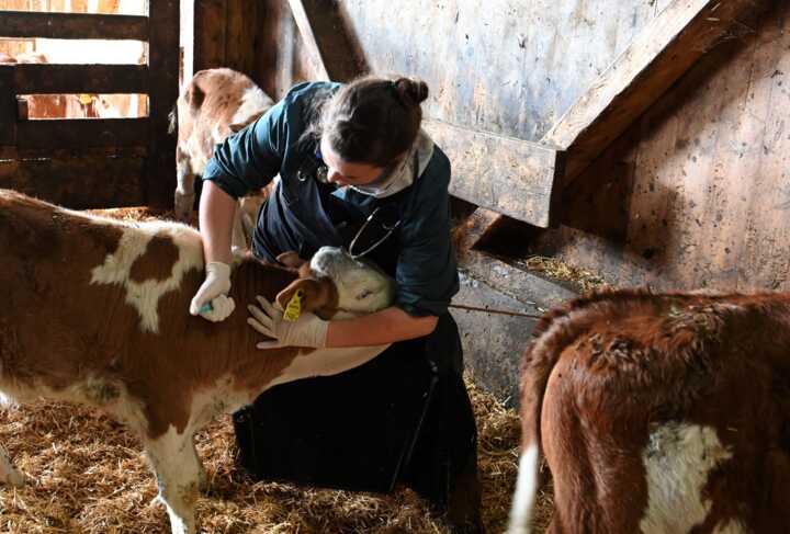 Beschreibung:Die Tierärztin auf dem Bild führt tierärztliche Untersuchungen an einem Kalb in einem Stall durch.