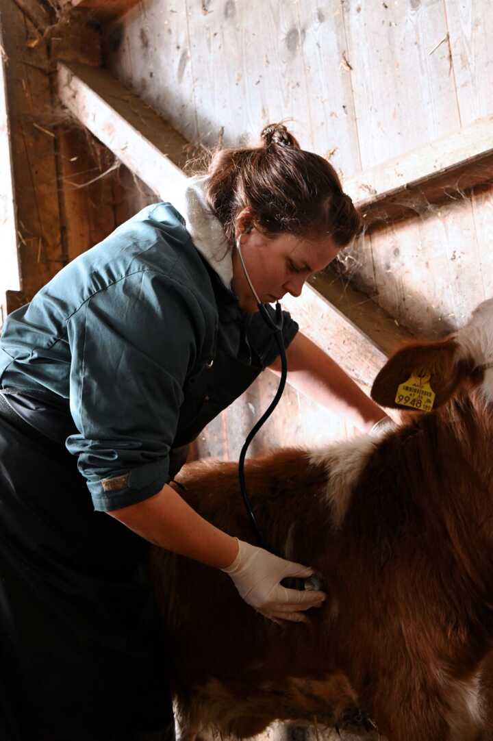 Beschreibung:Eine Tierärztin untersucht ein Kalb mit einem Stethoskop.