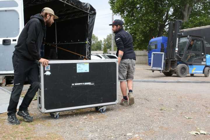 Beschreibung:Zwei Veranstaltungstechniker bewegen ein großes Transportcase.