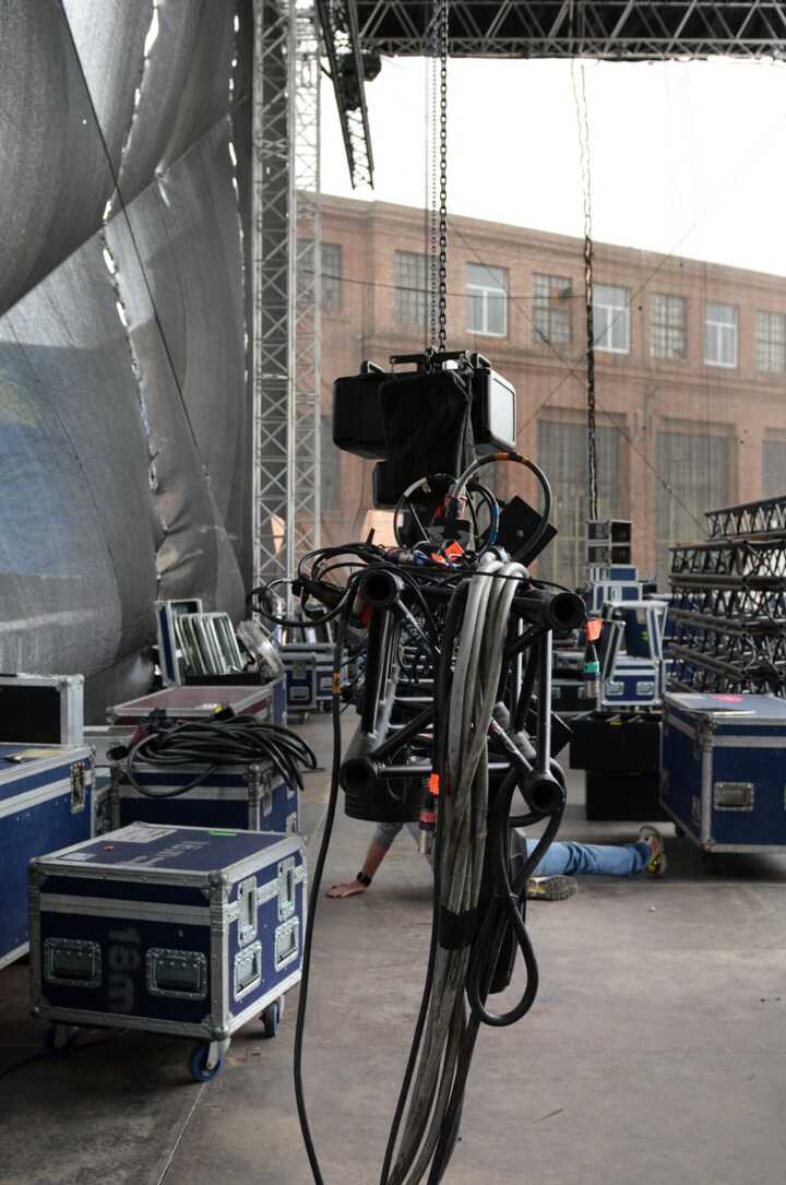 Beschreibung:Das Bild zeigt die Vorbereitung einer Bühne mit technischem Equipment.