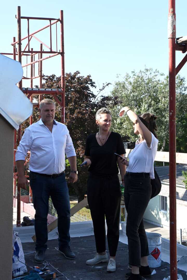 Beschreibung:Auf dem Bild sind drei ZiviltechnikerInnen auf einer Baustelle bei einer Planungsbesprechung zu sehen.