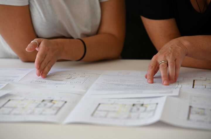 Beschreibung:Auf dem Bild sind zwei Ziviltechnikerinnen zu sehen, die Baupläne besprechen.