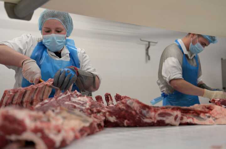 Beschreibung:Das Bild zeigt Personen, die in einer Fleischverarbeitung arbeiten und Fleisch zuschneiden.