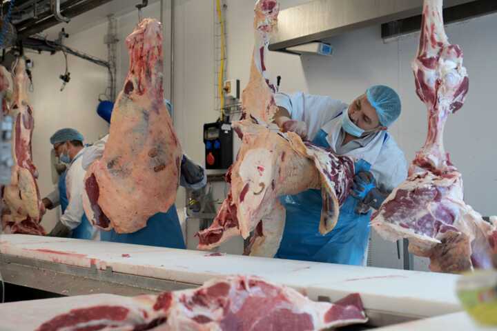 Beschreibung:Das Bild zeigt Personen, die in einer Fleischverarbeitungsanlage arbeiten und dabei Fleischstücke zerlegen.