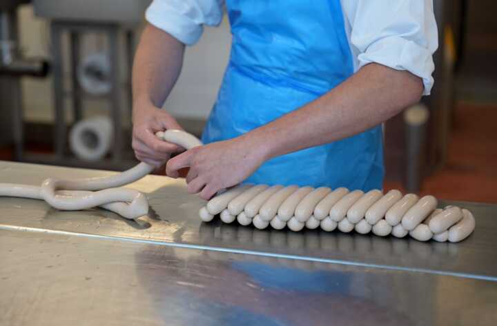 Beschreibung:Eine Person füllt und formt Würste in einer Fleischerei.