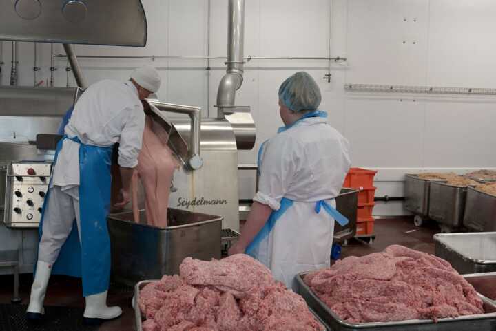 Beschreibung:Auf dem Bild sind Personen in einer Fleischverarbeitungsanlage zu sehen, die Fleisch in einer industriellen Maschine verarbeiten.