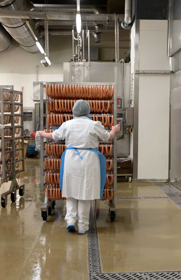 Beschreibung:Eine Person in Arbeitskleidung schiebt einen Wagen mit Würsten in einer Lebensmittelverarbeitungsanlage.