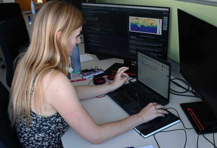 Beschreibung:Eine Wissenschaftlerin arbeitet an einem Schreibtisch mit mehreren Bildschirmen in einem Büro.