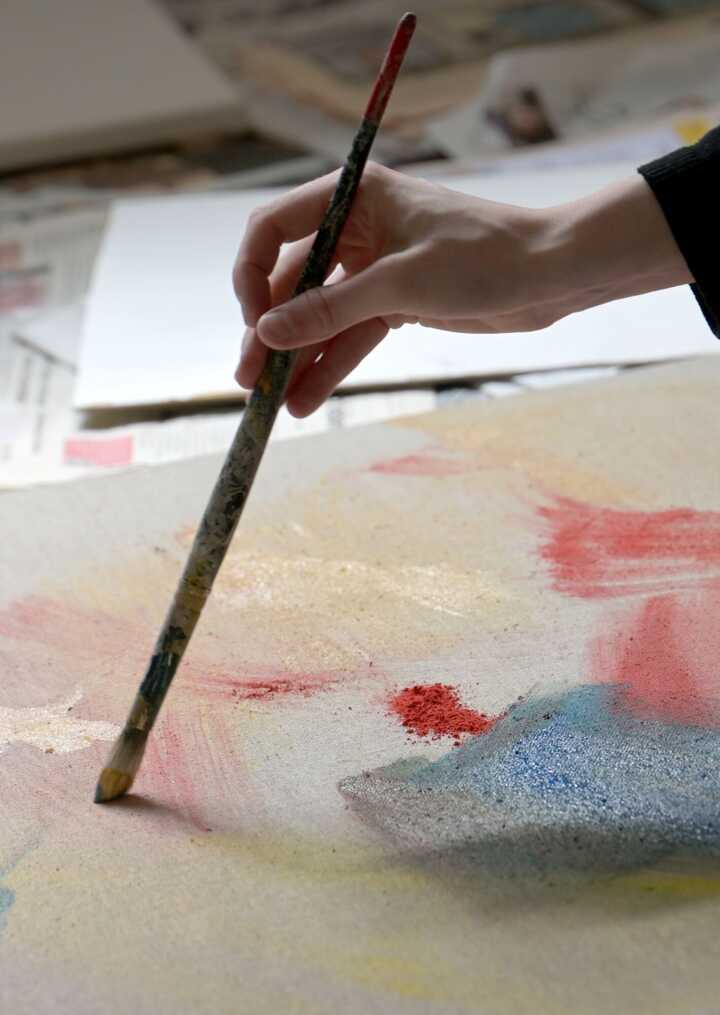 Beschreibung:Auf dem Bild ist eine Hand zu sehen, die mit einem Pinsel auf einer Leinwand malt.