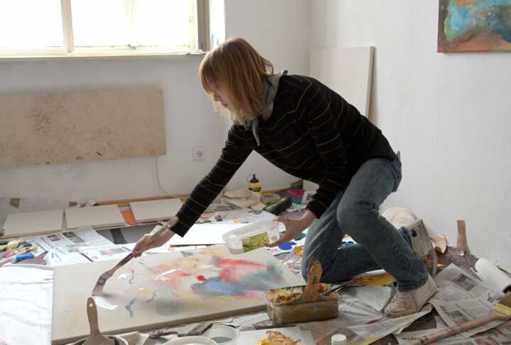 Beschreibung:Eine Person malt in einem Atelier auf einer Leinwand.