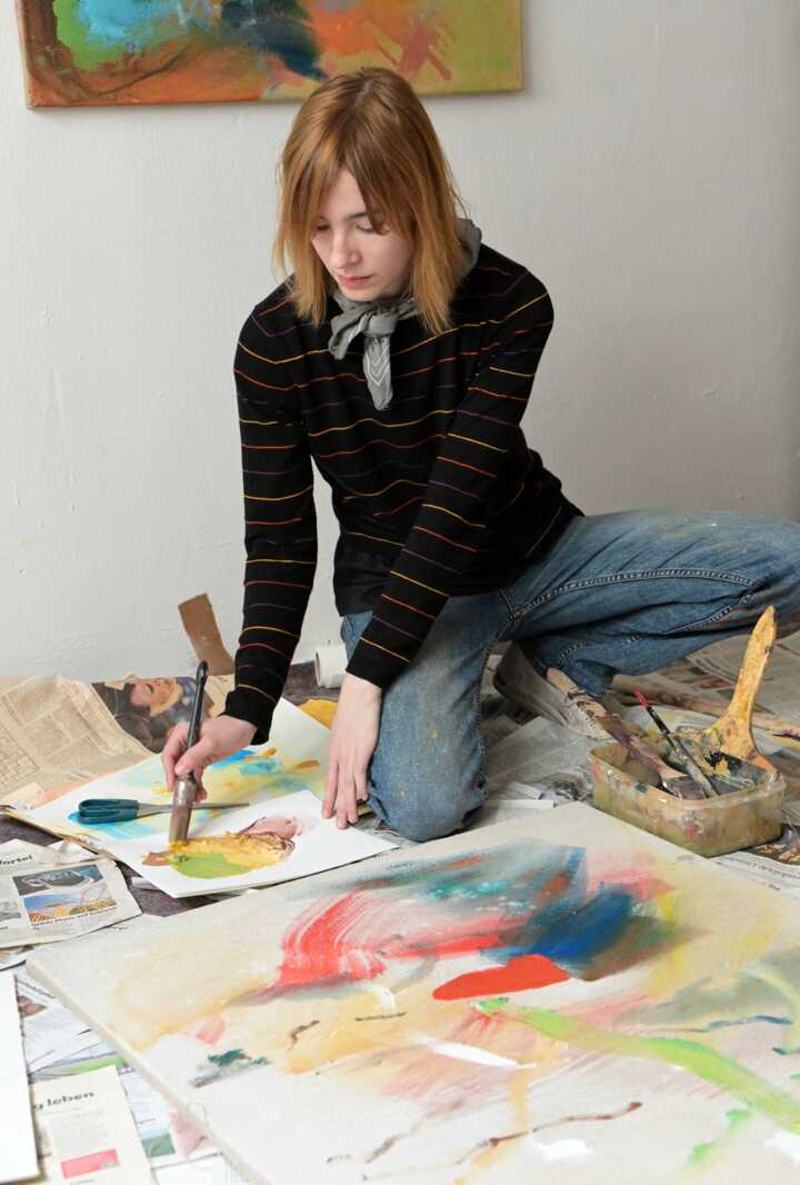 Beschreibung:Eine Person malt auf einer Leinwand und ist von Malutensilien umgeben.