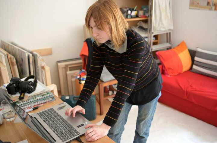 Beschreibung:Eine Person arbeitet konzentriert an einem Laptop in einem kreativ gestalteten Raum.