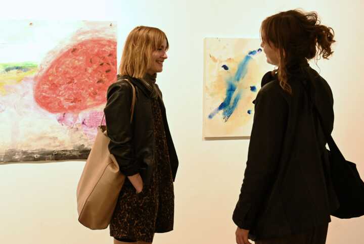 Beschreibung:Zwei Personen betrachten und diskutieren Kunstwerke in einer Galerie.