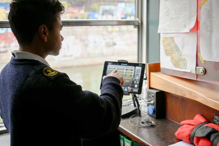 Beschreibung:Eine Person bedient ein Tablet in einem Kontrollraums zur Steuerung oder Überwachung des Schiffsverkehrs.