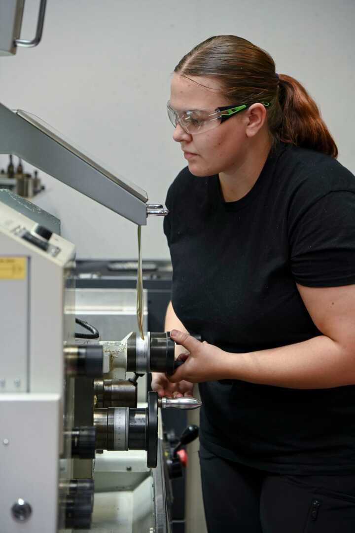 Beschreibung:Eine Person arbeitet konzentriert an einer CNC-Maschine in einer Werkstatt.