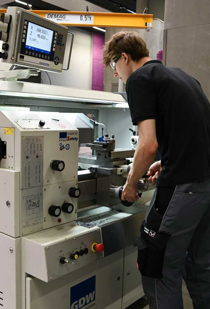 Beschreibung:Ein Mann bedient eine Drehmaschine in einer Werkstatt.