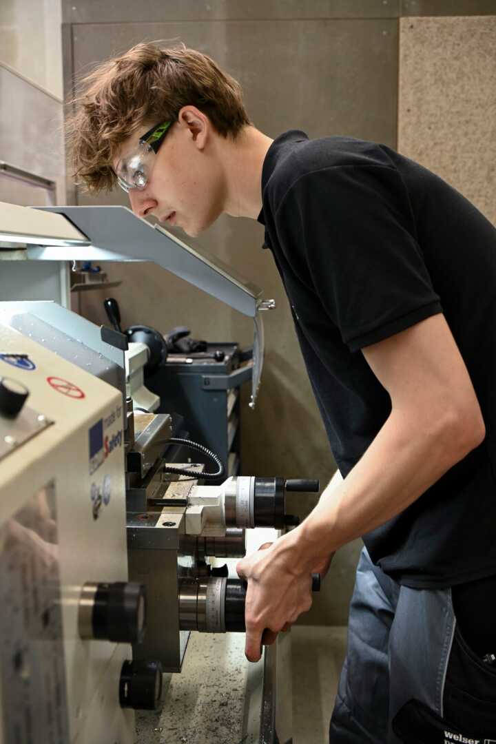 Beschreibung:Auf dem Bild ist eine Person zu sehen, die an einer Drehmaschine arbeitet.