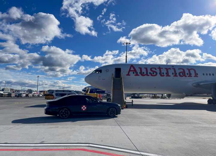 Beschreibung:Ein Mitarbeiter auf dem Rollfeld koordiniert den Bereich um ein Flugzeug der Austrian Airlines.