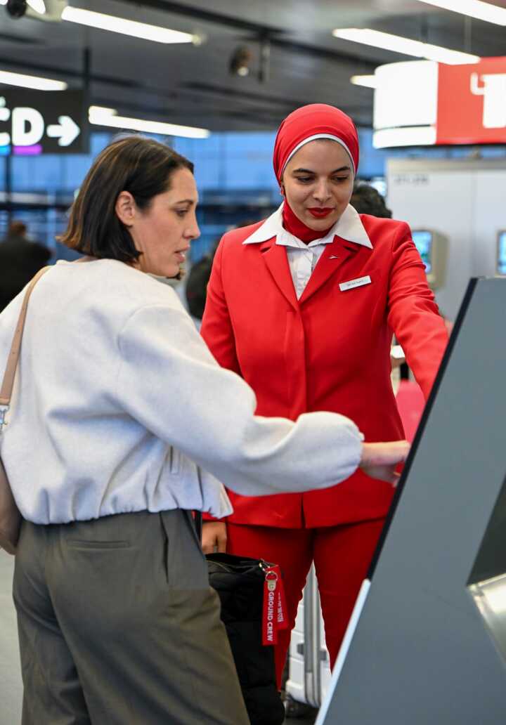 Beschreibung:Eine Flughafenmitarbeiterin in roter Uniform hilft einem Passagier am Check-in-Automaten.