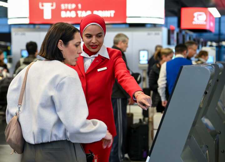 Beschreibung:Eine Mitarbeiterin am Flughafen hilft einer Reisenden bei der Nutzung eines Check-in-Automaten.