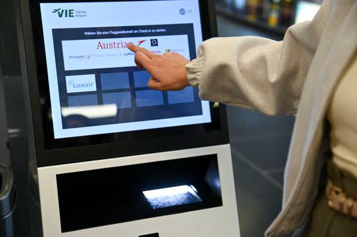 Beschreibung:Eine Person nutzt einen Check-in-Automaten am Flughafen.