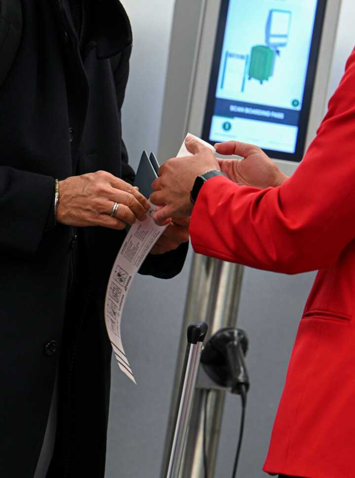 Beschreibung:Eine Person in roter Uniform überprüft die Bordkarte eines Reisenden am Flughafen.