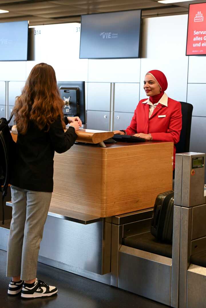 Beschreibung:Eine Person in einer Uniform arbeitet am Check-in-Schalter eines Flughafens und hilft einem Reisenden.