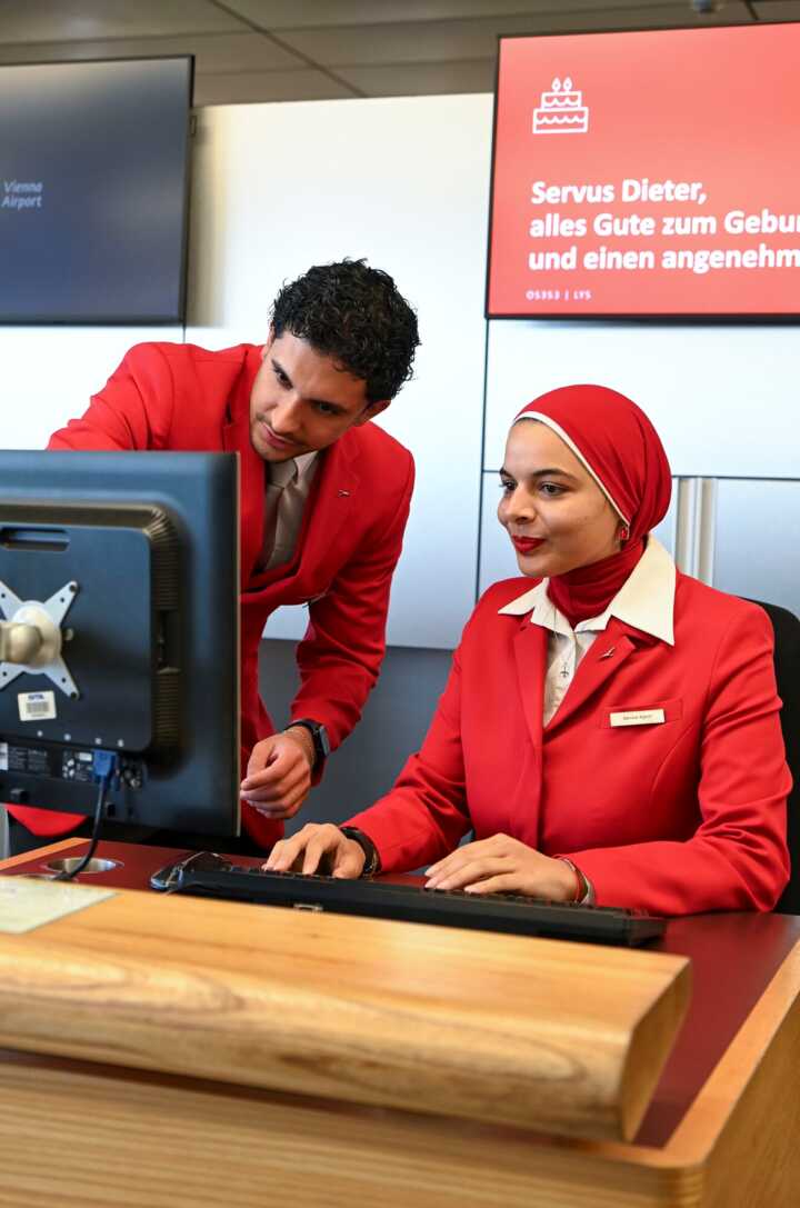 Beschreibung:Auf dem Bild sind zwei Personen in roter Berufskleidung an einem Empfangsschalter zu sehen, die am Flughafen im Kundenservice arbeiten.