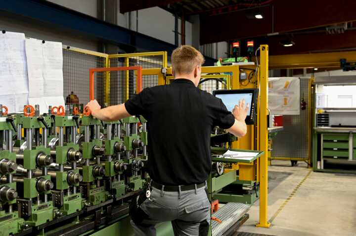 Beschreibung:Eine Person arbeitet an einer industriellen Maschine und bedient ein Touchscreen-Panel in einer Fabrikumgebung.