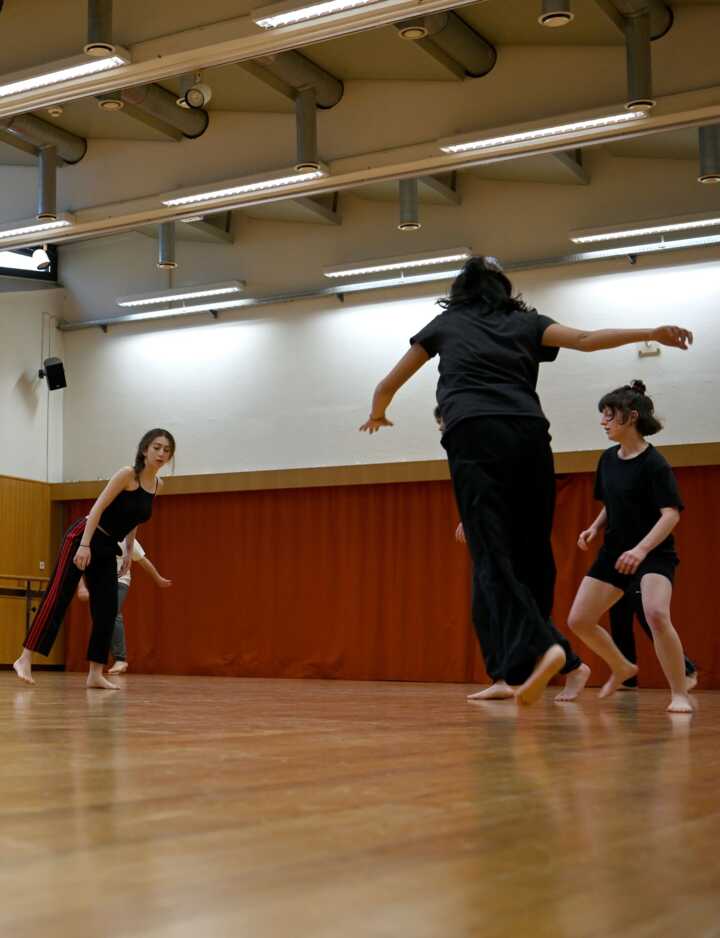 Beschreibung:Das Bild zeigt Personen in einem Tanz- oder Schauspielstudio, die Schauspielübungen durchführen.