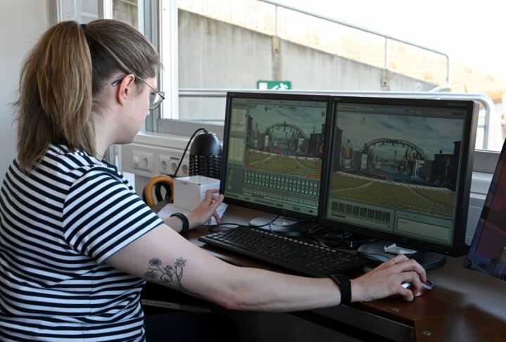 Beschreibung:Eine Person arbeitet an einem Computer mit zwei Bildschirmen.