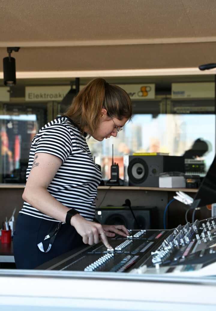 Beschreibung:Eine Person arbeitet an einem Mischpult in einem Tonstudio.