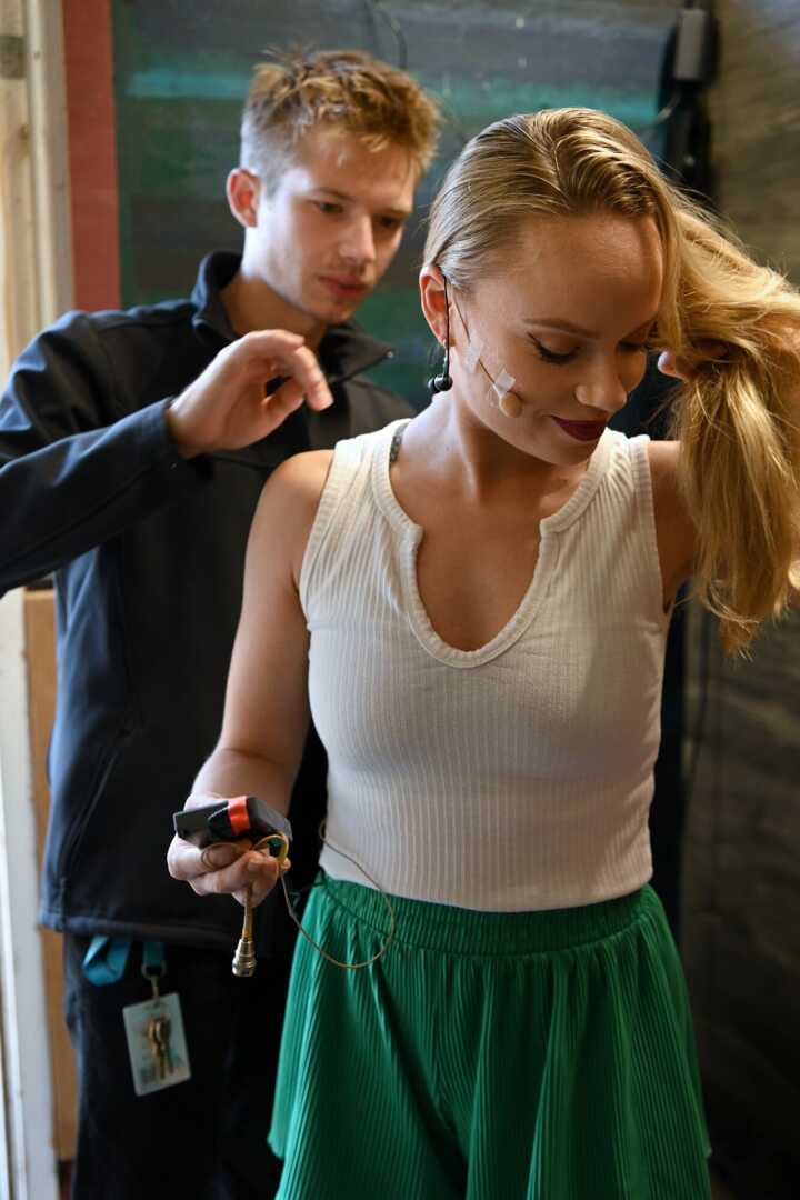 Beschreibung:Auf dem Bild wird einer Person ein Mikrofon angebracht.