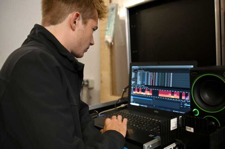 Beschreibung:Ein Mann arbeitet an einem Laptop mit Audio-Software.