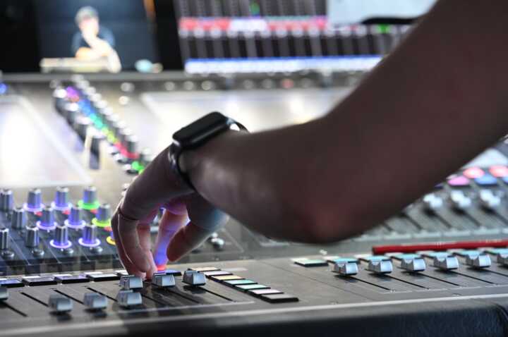 Beschreibung:Auf dem Bild ist eine Person zu sehen, die ein Mischpult bedient.