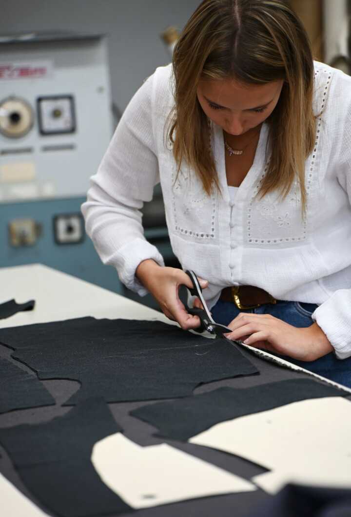 Beschreibung:Eine Person schneidet Stoffe zu.